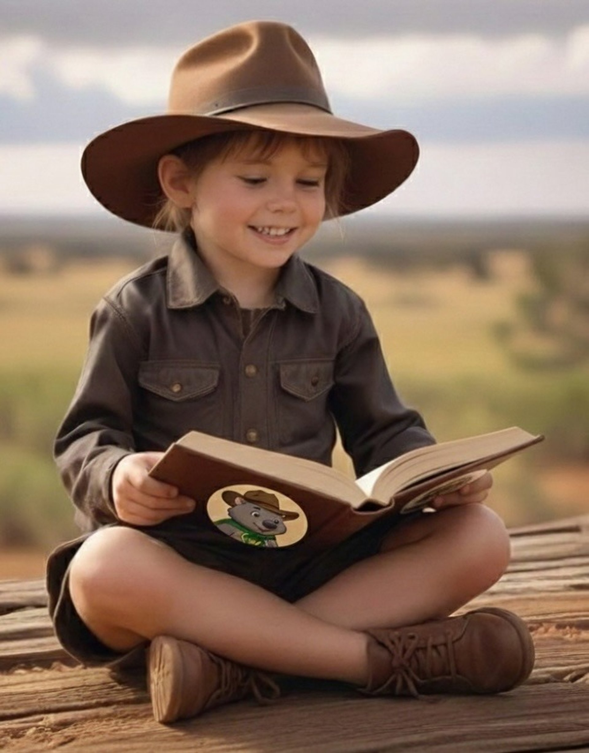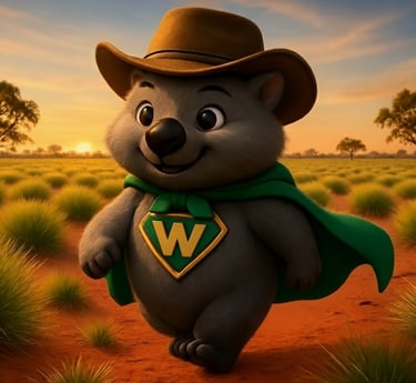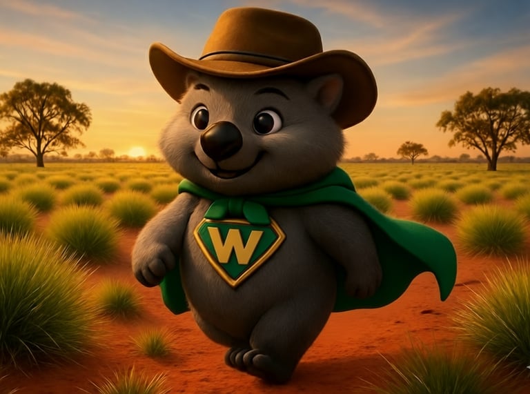 This is Sarah, our friendly Australian hairy-nosed wombat with a big heart and a passion for her outback home. Always ready for an adventure in her iconic Akubra hat and green and gold cape, Sarah is a knowledgeable guide who loves teaching young readers about the amazing natural science and unique customs of Australia. Whether she is exploring the bush or meeting new animal friends, Sarah is on a mission to protect the bush and share the magic of the outback with every child she meets.
